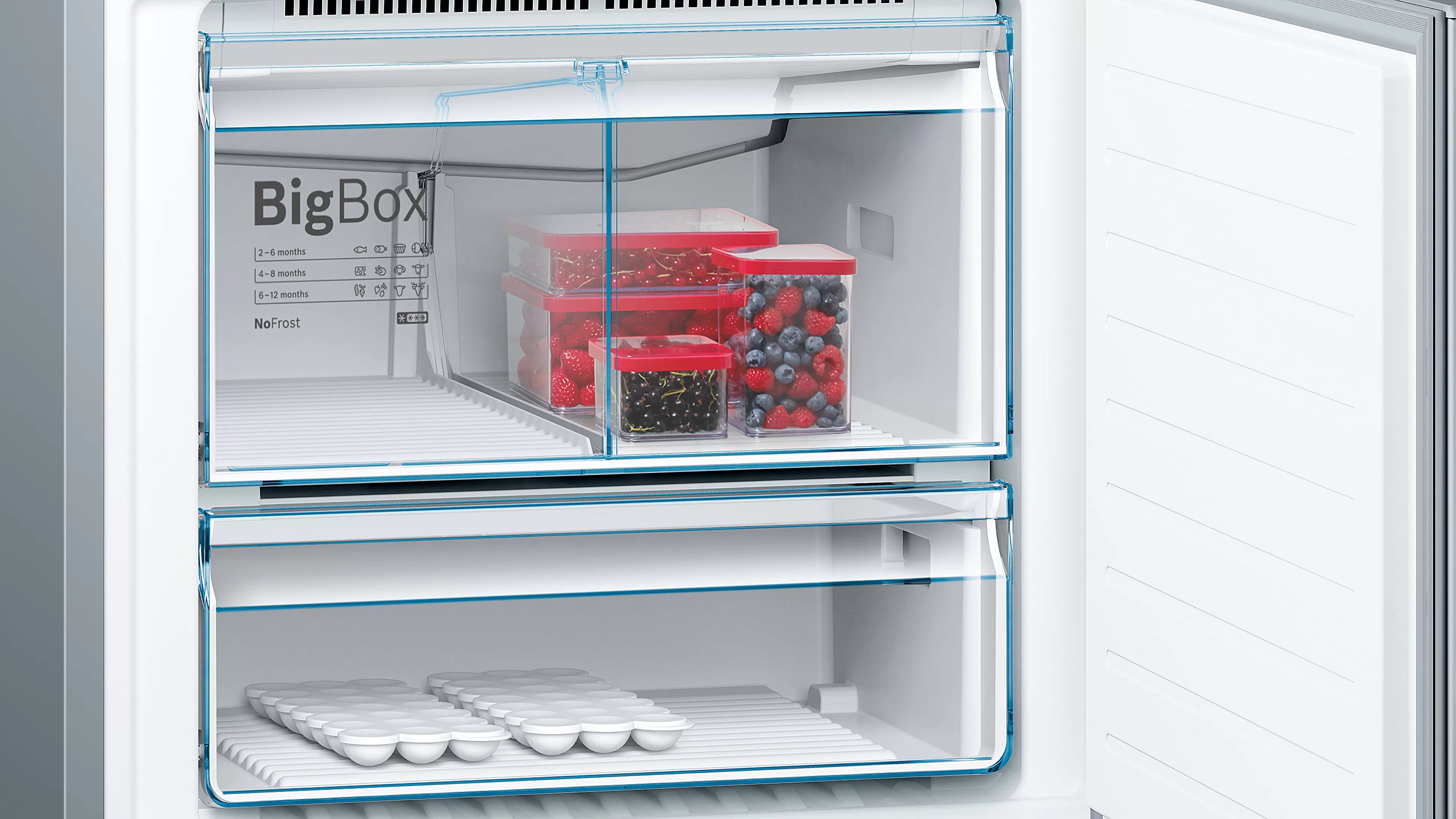 The Bosch 521L Bottom Freezer has No Frost technology, therefore the freezer defrosts by itself. Ice build-up is thus prevented by the air circulating system. Which removes humidity from your freezer. You can now benefit from not having to use physical effort to defrost your freezer manually.