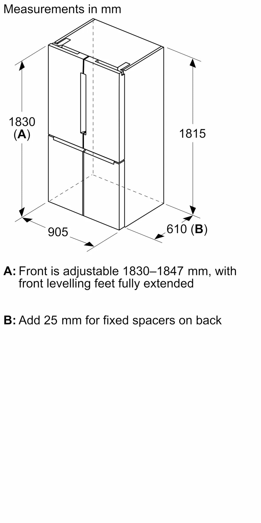 Measuring 1830mm (H) x 905mm (W) x 731mm (D), this Bosch French Door Fridge is designed for modern kitchens. Plus, enjoy peace of mind with a 3-year warranty.