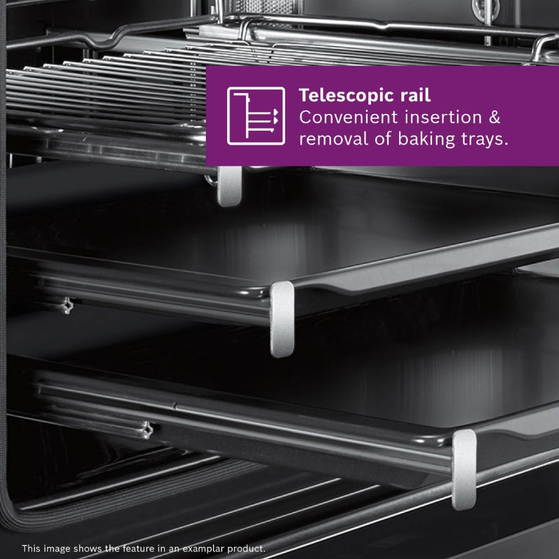 This oven comes with slim universal pans designed for cooking smaller portions. Perfect for multi-dish cooking—whether it’s baked potatoes or stuffed tomatoes—these trays are dishwasher-friendly and also fit neatly into your Bosch fridge for storage.