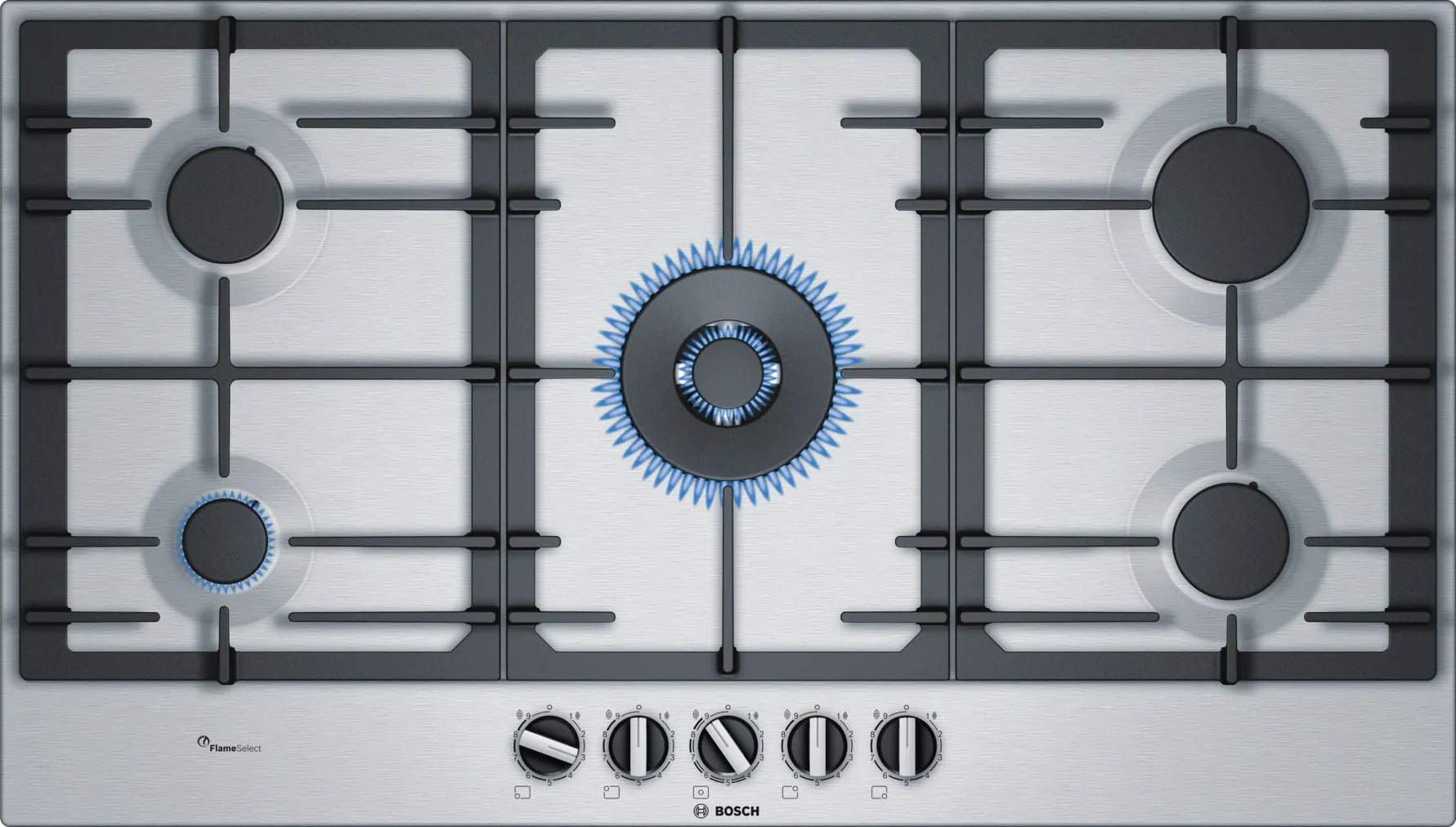 BOSCH 90CM GAS HOB 5 BURNER WITH 1 DUAL WOK BURNER STAINLESS STEEL - PCR9A5B90Z