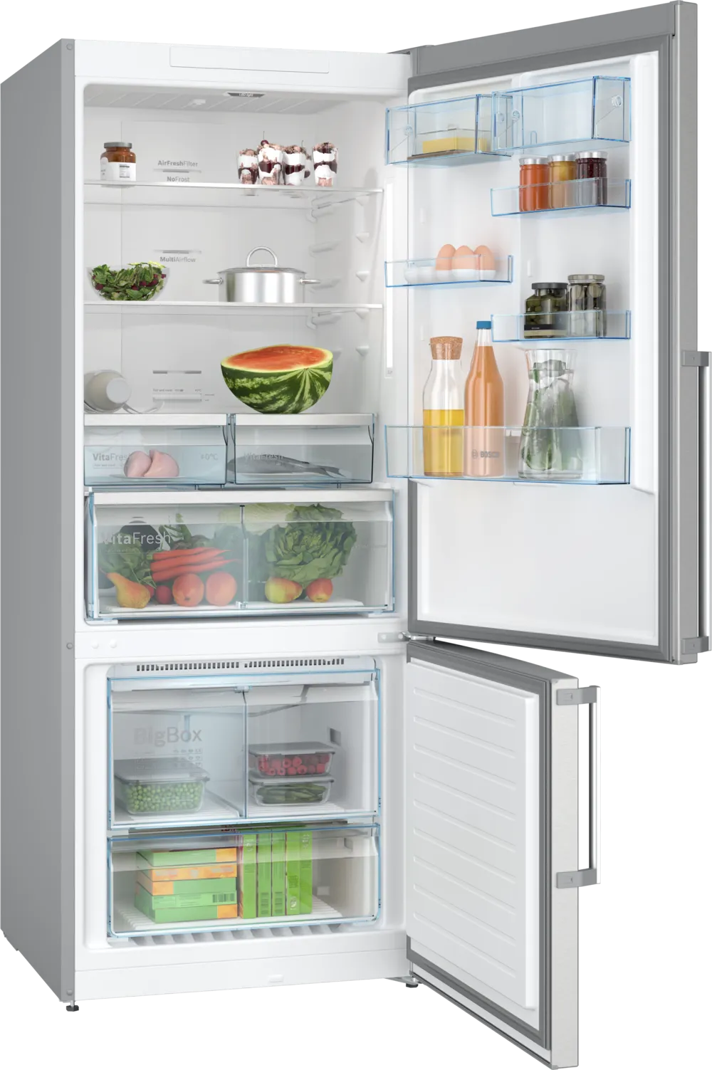 Perfect for large families and those who love to cook, this Bosch bottom freezer fridge offers advanced cooling technology and ample space while blending seamlessly into your modern kitchen. With Total No Frost convenience, VitaFresh XXL drawers, and an elegant anti-fingerprint finish, it delivers both performance and style.