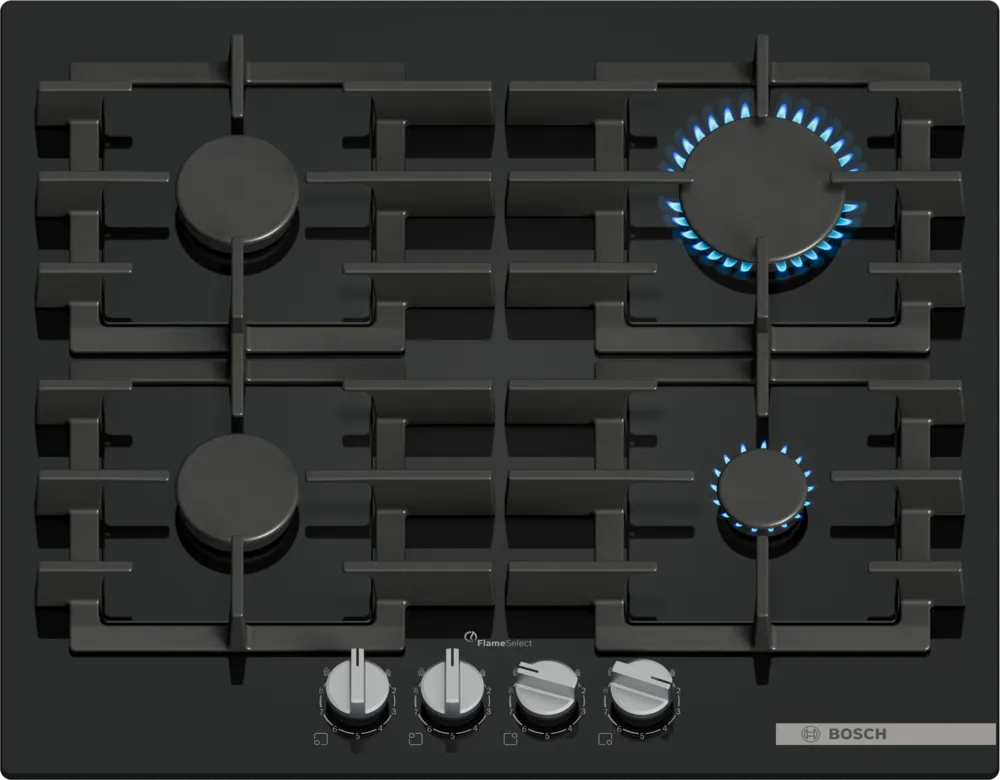 Elevate your kitchen with the Bosch Series 6 60cm Gas Hob, where sleek black tempered glass meets high-performance German engineering. Designed to combine elegant aesthetics with everyday functionality, this gas hob delivers precise flame control and fast heating for effortless cooking.