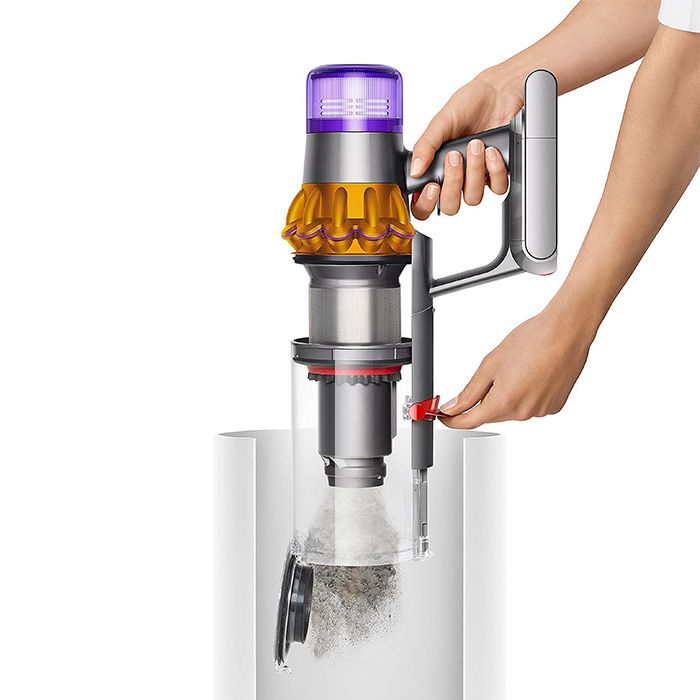 Dyson reveals microscopic dust. Dyson’s most powerful, compact cordless vacuum. Sizes and counts dust particles. Shows results on-screen as you clean. Single button power control.