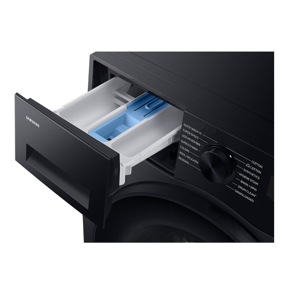 The Samsung 11kg Front Loader Washing Machine in Black features AI Ecobubble™ technology for efficient and intelligent washing. It creates bubbles that remove 24% more soil even at low temperatures, saving 70% energy and ensuring 45.5% better fabric care. With a sleek design and SmartThings app support, it's perfect for modern households.