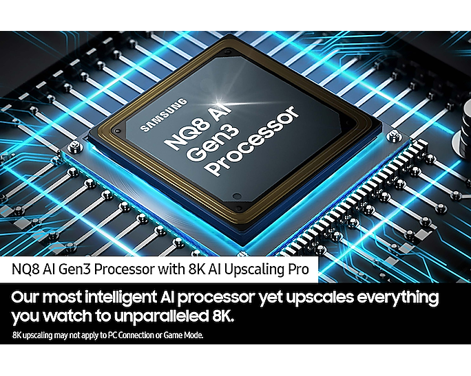 NQ8 AI Gen3 Processor: The high-performance processor optimizes content for 8K resolution, enhancing details, depth, shading, and textures while also improving audio and overall TV performance.