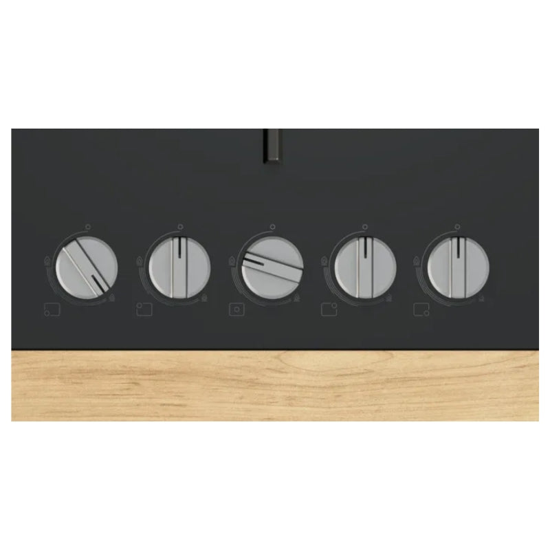 The Bosch Series 6 Gas Hob PPQ9B6140M is a 90cm wide gas hob with a sleek black tempered glass surface. It features 5 burners, including a Dual-Flame Power Burner for flexible cooking options. The hob has knob ignition and a flame failure device for safety.
